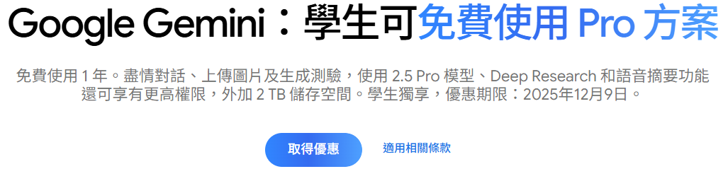 完成後你會取得 Google AI Pro(Gemini Pro)一年的學生權益:例如 2.5 Pro 模型、Deep Research、語音摘要、2 TB One 儲存空間等(以官方公告為準)。