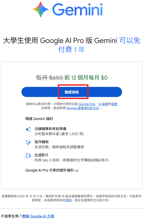若你符合學生優惠,系統會將 第一年設為免費(1 年免費使用 Google AI Pro),之後依照合約自動續訂並收費。